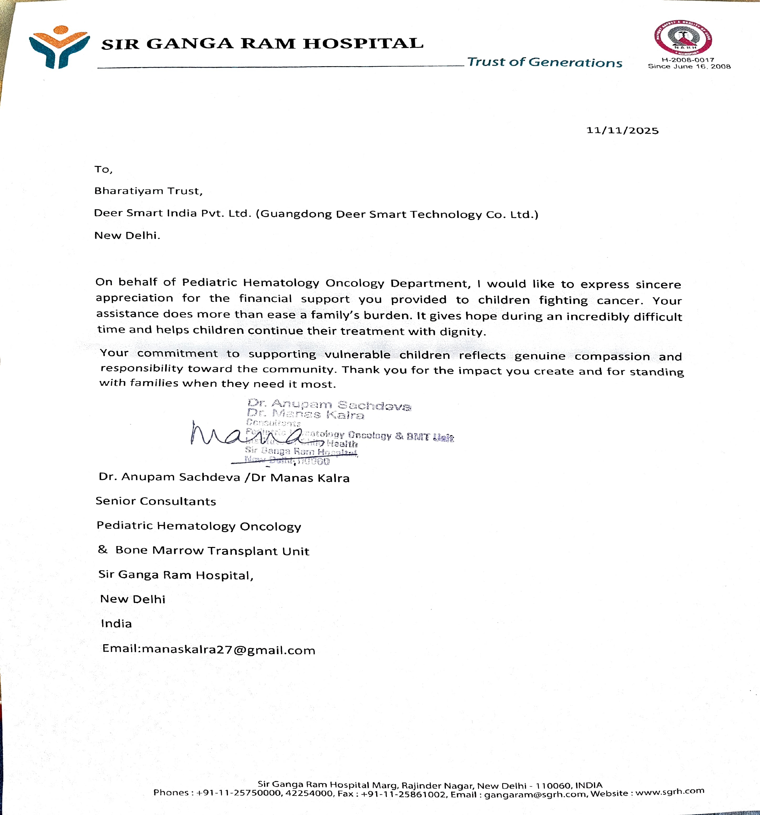 Appreciation Letter from Sir Ganga Ram Hospital, New Delhi